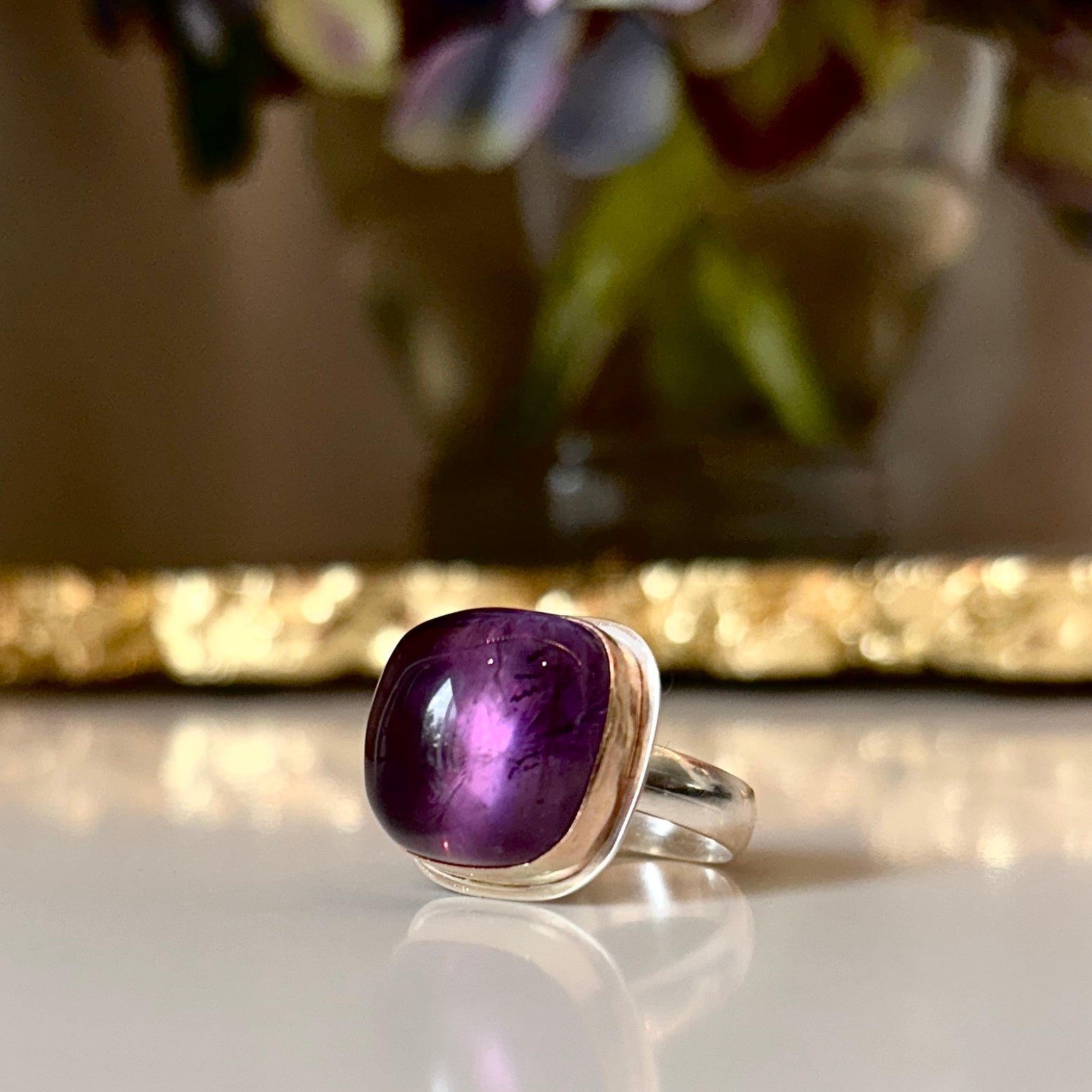 Stunning statement ring features a huge smooth Brazilian Amethyst cabochon set in mixed metal setting