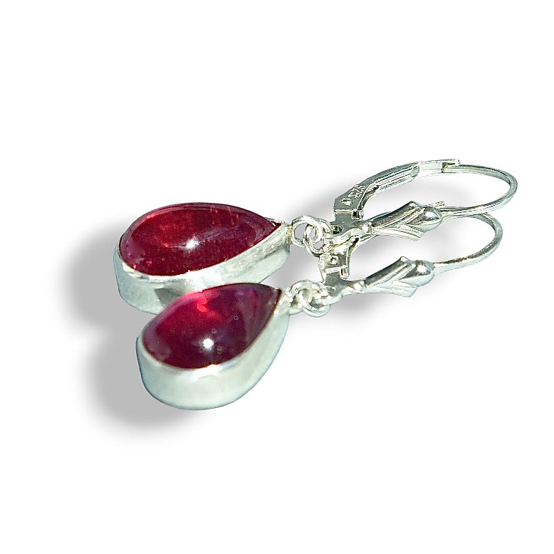 Highest quality, all natural blood red Ruby from Afghanistan, set in fine and sterling silver and hung on fleur de lis sterling leverback ear hooks.Β
