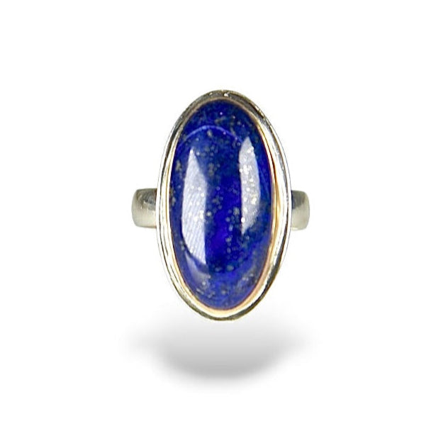 Stunning lapis is set in a 14k gold fill bezel atop a sterling silver platform and band.
