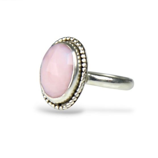 Pretty natural pink opal from Peru, set in a sterling silver beaded frame, platform and narrow band.