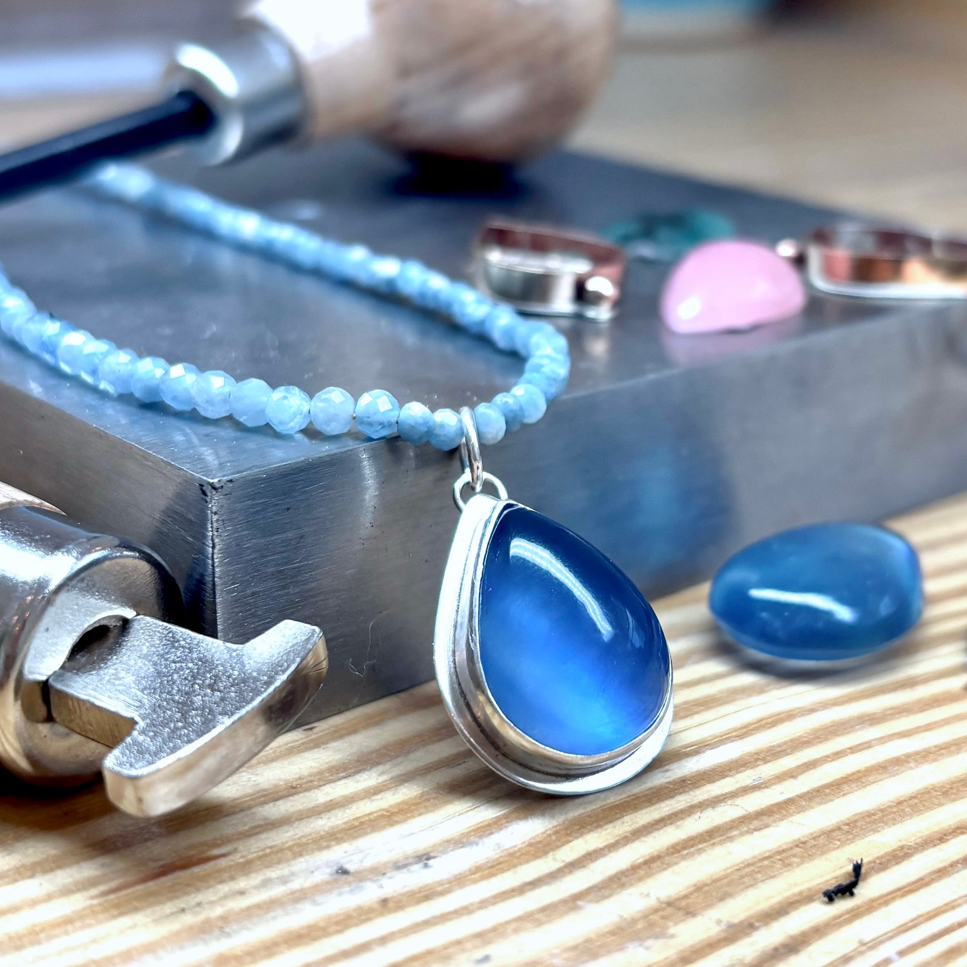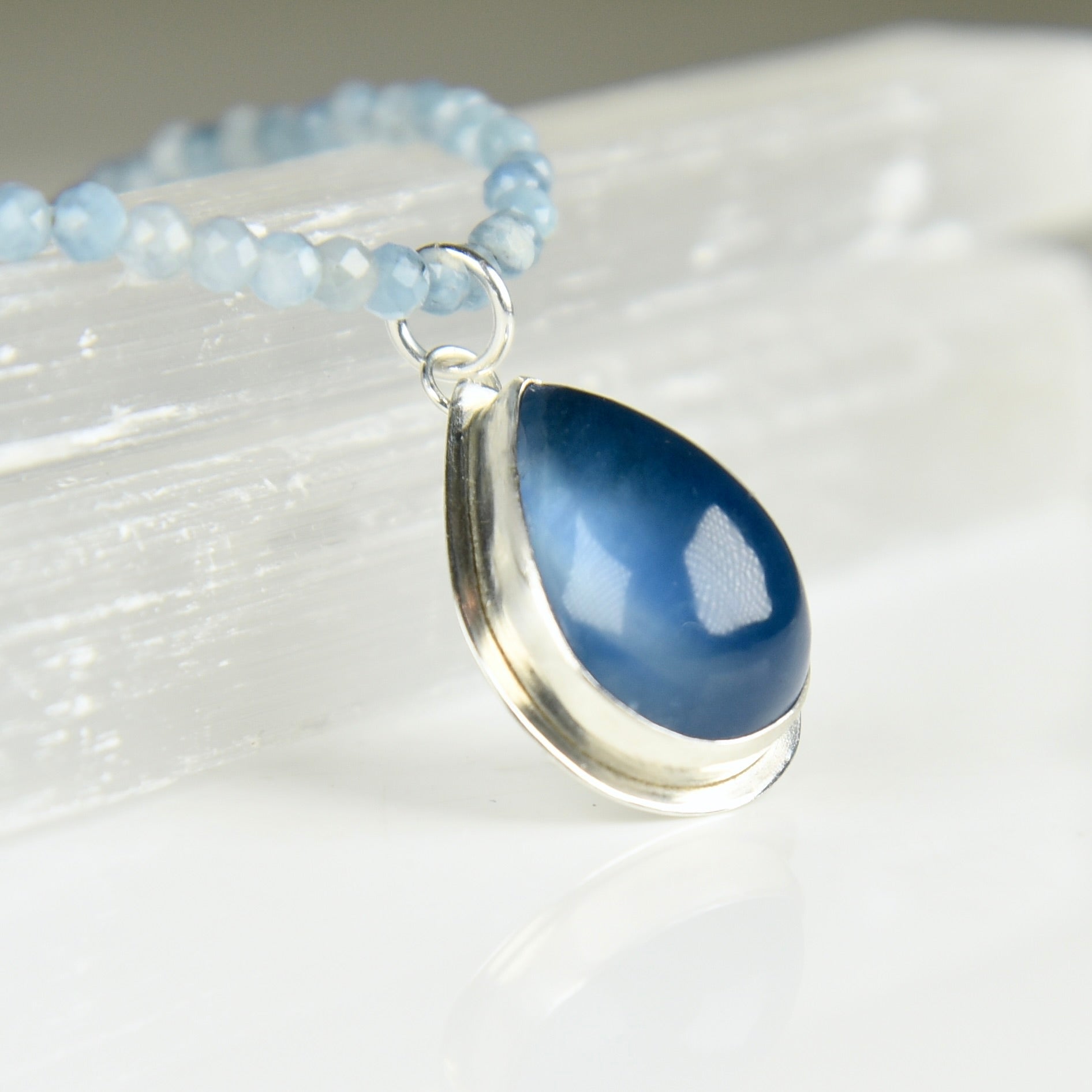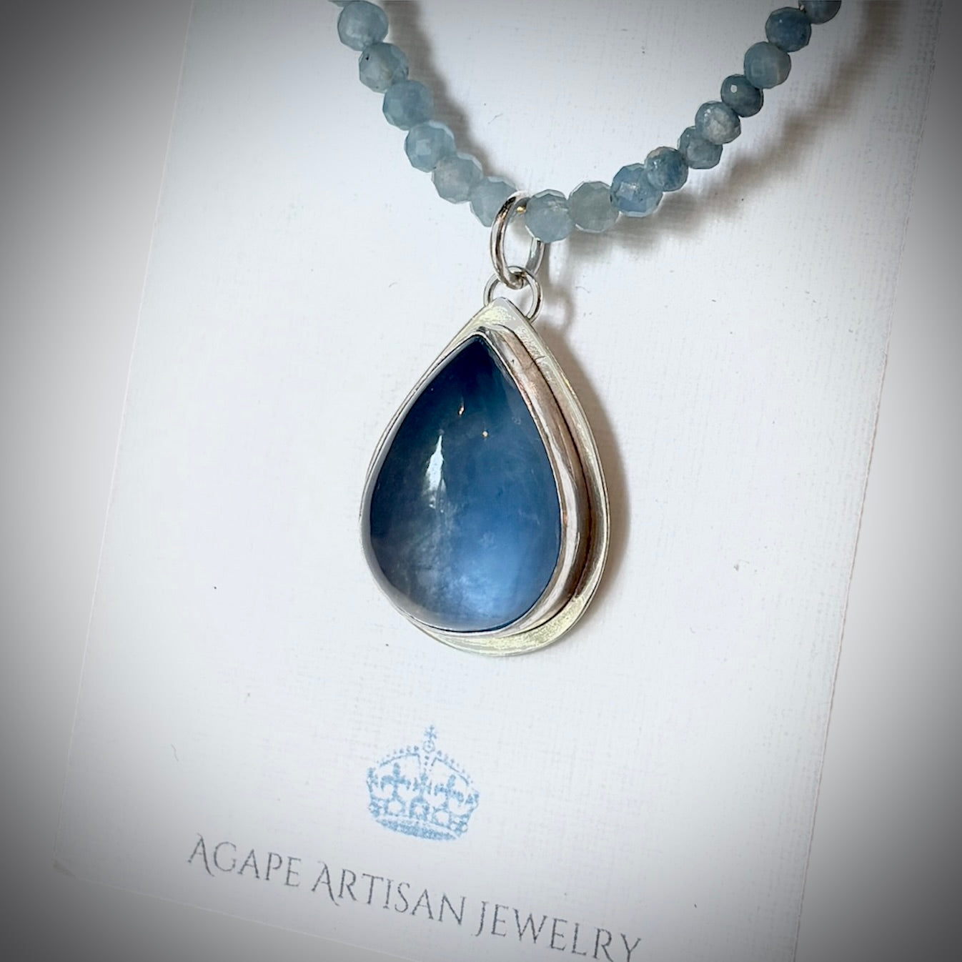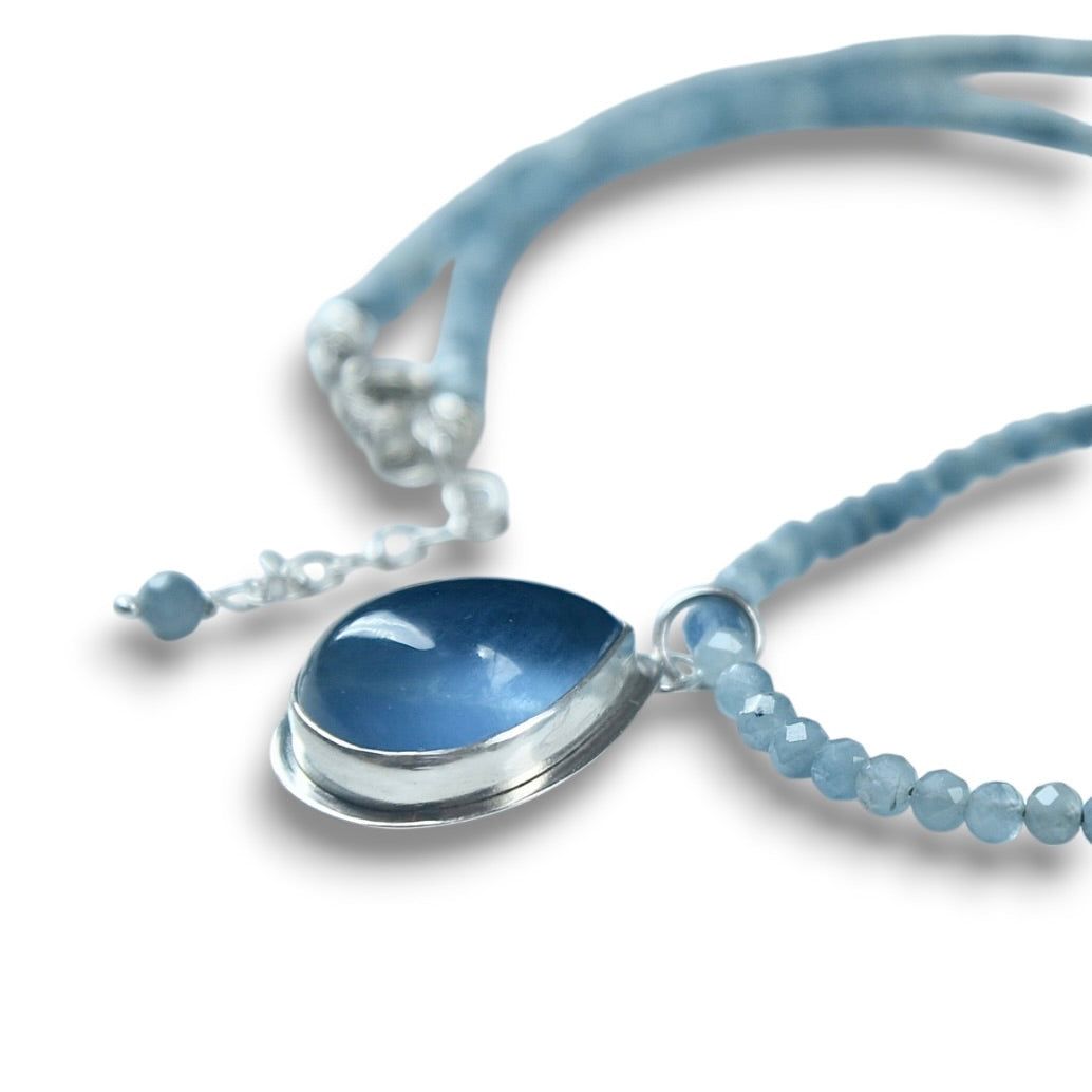 A stunning Belgian teal fluorite in a fine and sterling setting, hung on aquamarine beaded necklace.
