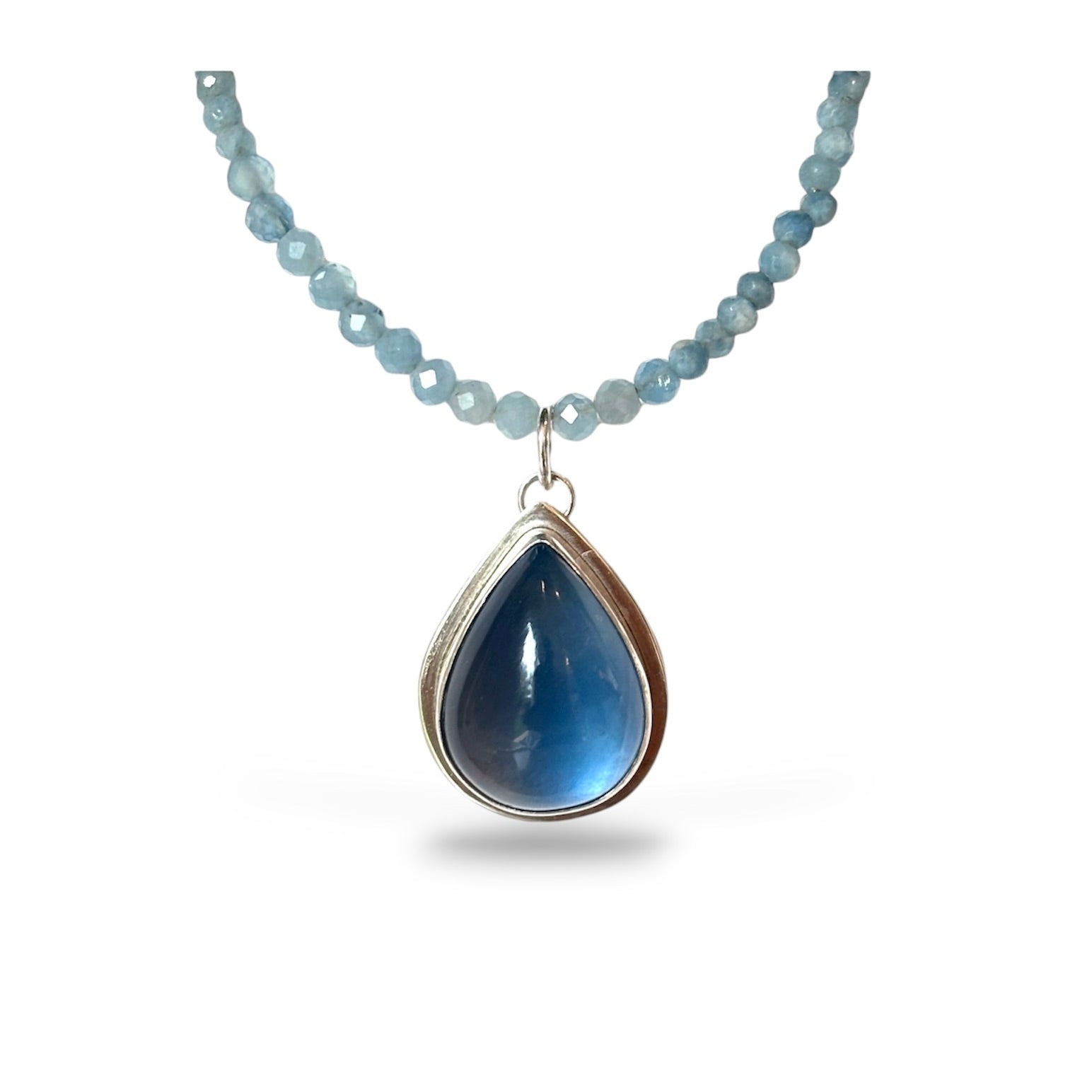 TEAL FLUORITE STERLING PENDANT ON AQUAMARINE NECKLACE